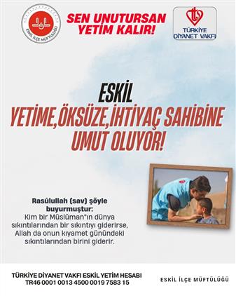 "Onlar yiyeceği seve seve yoksula, yetime ve esire yedirirler." ayetinin ve birçok ayeti kerime ve hadisi şerifin düsturuyla; yetim ve öksüzler başta olmak üzere ihtiyaç sahibi kardeşlerimize destek olmak, onların duasını almak için Eskilli vatandaşlarımızı bu kampanyaya destek vermeye davet ediyoruz.