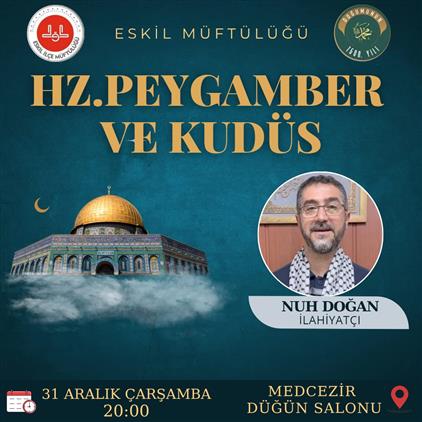 31 Aralık Çarşamba saat 20.00'da Medcezir Düğün Salonu'nda İlahiyatçı/Eğitimci Nuh DOĞAN hocamızın konuşmacı olarak katılacağı "HZ. PEYGAMBER VE KUDÜS" konulu konferansa bütün halkımız davetlidir.
