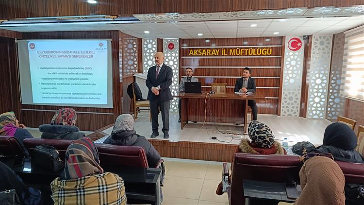 İl Müftümüz Veysel Işıldar; Müftülüğümüz ve İŞKUR Aksaray İl Müdürlüğü tarafından yürütülen proje kapsamında geçtiğimiz hafta yapılan kura sonucunda işe girmeye hak kazanan vatandaşlarımıza yönelik, Müftülük konferans salonunda devam eden “Ön Bilgilendirme Seminerine” katıldı.